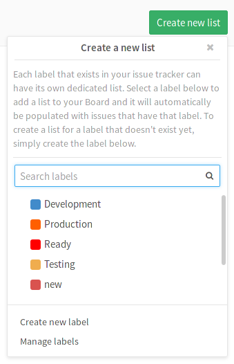Create a new list by clicking on the Create new list button at the upper right corner of the Issue Board.