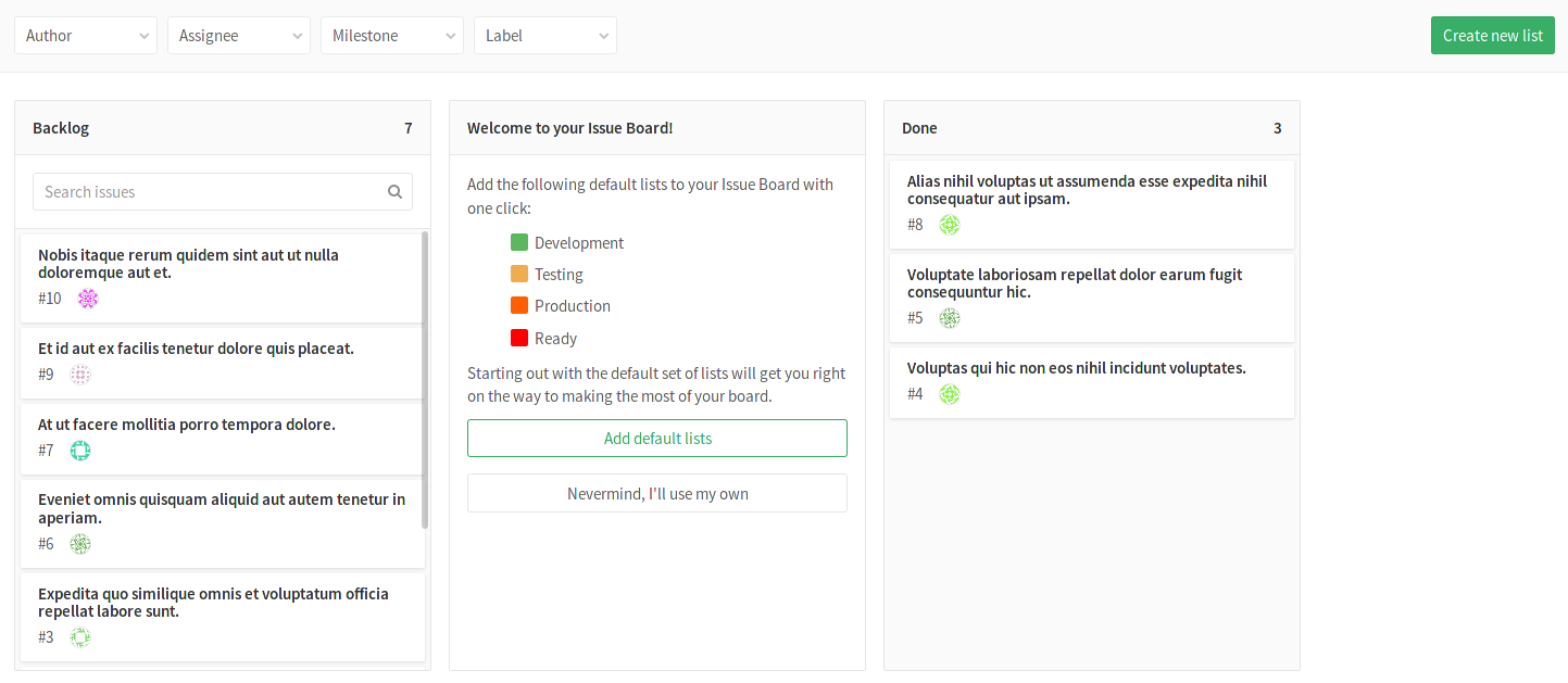 The very first time you start using the Issue Board, it is very likely your issue tracker is already populated with labels and issues. In that case, Backlog will have all the issues that don't belong to another list, and Done will have all the closed ones.